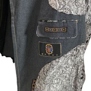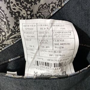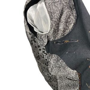 Beautiful jacket in new condition. Shoulders are slightly padded outer breast pocket, two deep outer pockets, three inner pockets. Light gray and silver paisley liner with geometric panels.