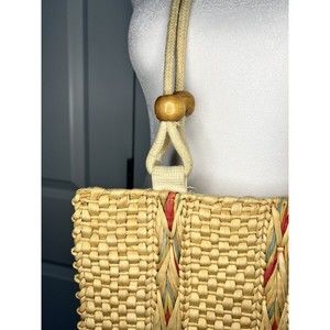VTG Medium Size Beige Woven Straw Wood Bead Braided Rope Handle Tote Handbag. Minor staining inside of the bag. Great condition otherwise for this fun vintage piece!