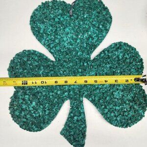 Vintage melted plastic popcorn shamrock decoration. Hanging hole on top with string loop. St. Patty's Day decoration. Approximately 15x14". St Patrick's Day green clover.