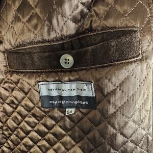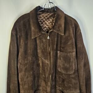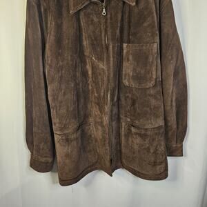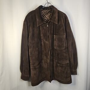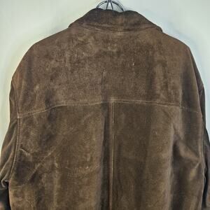 The VTG Men's Metropolitan View Heavyweight Suede Jacket Car Coat in size 54 or 2XL is a stylish and versatile piece made in Italy. This mid-length coat features a relaxed fit, zip and button closure, and quilted accents for added flair. The brown suede outer shell and lining give it a classic and designer look, perfect for travel, casual outings, or workwear. This vintage piece is a timeless addition to any man's wardrobe, ideal for the winter, fall, or spring seasons.