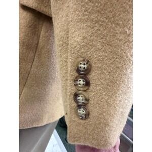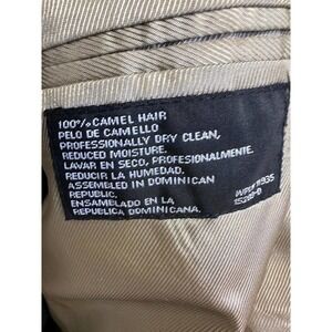 100% Camel Hair, Dry Clean Size 42 L is marked inside. Excellent preowned condition.