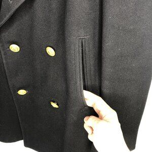 This vintage US Navy coat is a classic piece made from 100% wool, featuring gold eagle buttons and a double-breasted design.