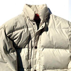 This pre-owned, vintage William Barry Polar Gear down jacket is the perfect way to keep you warm. Mid-length and in excellent condition. Light Khaki shell with red and black interior lining. Full Zip, Snaps, Insulated. Gear Up and save on one Puffy Polar Puffer.