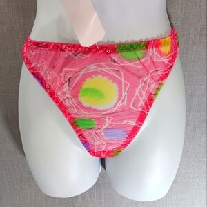 Up for sale is a fun and colorful pair of vintage string bikini/thong panties by Sophia. It is mainly pink with colorful dots and white zig zagging. They are size 7. They are new with the tag. I'm guessing they were made in the 90s from the style of the tag itself but they could be from the 80s. They really are cute and look better in person. They're made of sheer mesh and even have a faux diamond in a flower on the center of the front edge. They are made of nylon. I will be listing a good dozen or so of vintage panties and other lingerie items that are all new with tags if you're interested in looking. Thanks for looking!