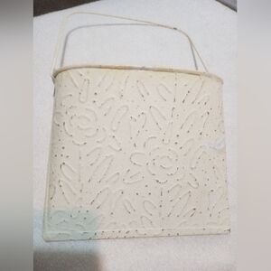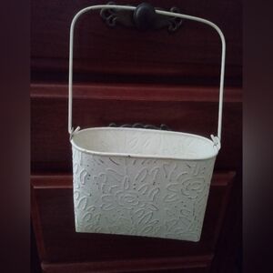 This flattened metal hanging wall pocket can hold dried flowers for a French Country or Shabby Chic look. It can also hold mail or important papers. It's handle is metal and hangs approximately 5.5 inches. It measures 6 inches high without the handle and 7 inches wide. The opening at the top measures 3 inches wide. It has embossed flowers and embossed hearts on it.