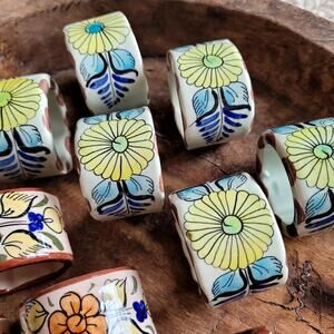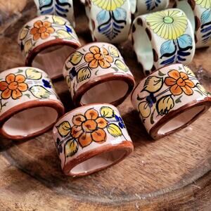 Add a touch of Mexican charm to your table setting with this delightful set of vintage napkin rings! This set includes 11 hand-painted ceramic napkin rings. Each ring showcases unique, vibrant designs that capture the essence of Mexican folk art. Perfect for adding a pop of color and personality to your dining experience. One ring has a crack. See photos for details. Don't miss out on this unique find!