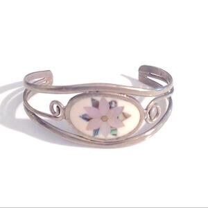 Vintage Mexican Silver CUFF BRACELET Flower Floral Abaone Shell Mother of Pearl Shell Flower