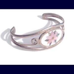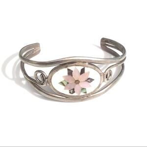 VTG Mexican Silver CUFF BRACELET Flower Floral Abaone Shell Mother of Pearl 6”