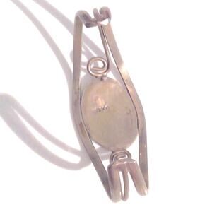The bracelet features an oval medallion to the center, which is inlaid with multi-colored abalone shell and white mother-of-pearl. It is marked Mexico to the inside. Total weight is approximately 0.45ozt. This item has been tested and verified by an independent GIA graduate gemologist. 2.0" W x 1.75" H x 1.0" D Total weight is approximately 0.45ozt.