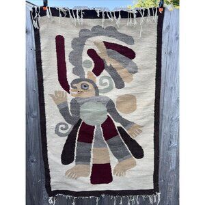 VTG Mexican Woven Wool Rug Aztec Standing Figure god Wall Hang 36" x 56" AS IS