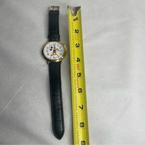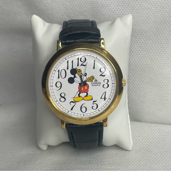 Pictures (can be zoomed in) also serve as product reference and condition for any overlooked blemishes. This is a fully refurbished watch with little signs of wear, minor scratches to the crystal and case, and a Brand New matching leather band with matching golden accent. Completely hand cleaned with no polishing and meticulously restored to working condition. A full service was rendered on 12/03/25 (including new battery replacement). The watch features large Arabic numeral display, sweeping seconds hand, and rotating Mickey Mouse hour hands!