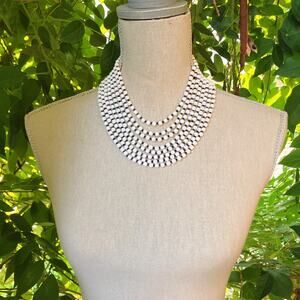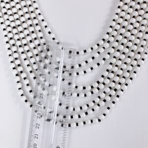 Features: Multi-strand bib collar design; high-contrast black and white palette; silver tone hook clasp with extender chain; elegant profile; imported from Japan