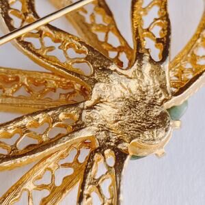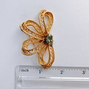 This gold-tone filigree bow brooch pairs elegant openwork with a dimensional sculpted design. The polished green center stone adds a subtle pop of color, balancing the ornate metalwork with natural texture.
