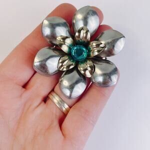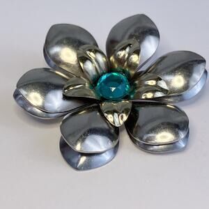 A bold mid-century brooch blending sculptural metallic petals with vivid aqua rhinestone contrast, offering vintage florals with industrial-modern mood.