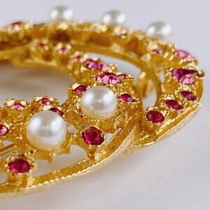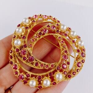 VTG Mid Century Brooch Faux Pearl Fuchsia Pink Rhinestone Layered Gold Tone Pin