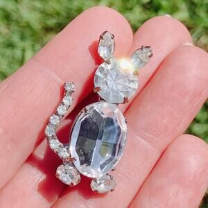 Materials: Silver tone metal; prong-set clear glass rhinestones (head, ears, tail, paws); faceted fashion-grade molded plastic belly stone