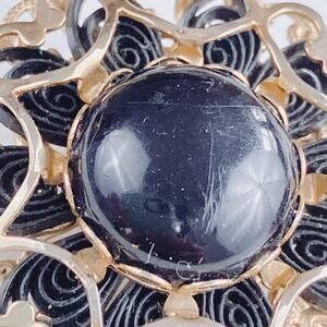 A bold yet elegant statement from the mid-century era, these ornate earrings blend dramatic black cabochons with gold-tone filigree in a timeless circular silhouette.