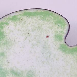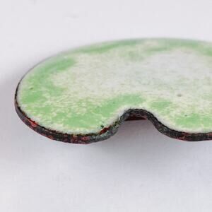 Features: Studio enamel; abstract lily pad shape; kiln-fired finish; garden motif; nature theme; frogcore; frog-adjacent; cottagecore