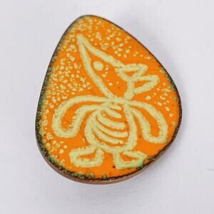 Features: Hand-enameled copper brooch; stylized animal motif resembling Piglet as illustrated in the original 1926 Winnie-the-Pooh book; vivid orange and yellow enamel; rollover safety clasp; artisan studio craft aesthetic