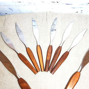 VTG Mid Century Modern Fleetwood Cutlery Flatware Butter/Carving Knives Set/8. Set of 6 butter knives; 1 serrated knife; 1 carving knife. I did not shine up...see pics.