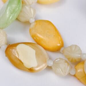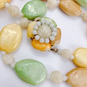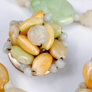 Cheerful and unmistakably retro, this pastel beaded necklace and earring set captures the fun-loving flair of mid-century costume jewelry at its most playful.