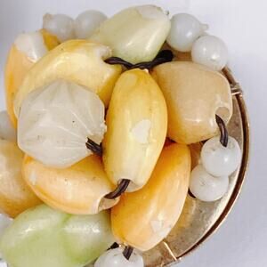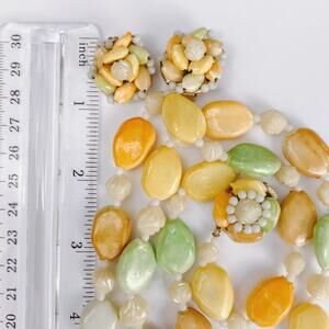 Features: Three-piece set; clip-on earrings; pastel yellow green and peach tones; wired bead clusters; barrel insert clasp