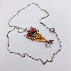 VTG Mid Century Owl Pendant Necklace Red Cabochon Eyes Mixed Metal 1970s