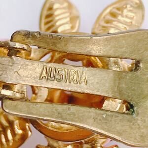 Features: Prong-set center rhinestones; clip-on backs; pink enamel petals with molded leaf texture; stamped "Austria"