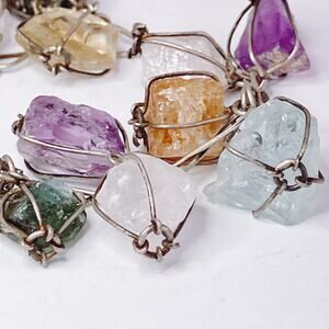 Materials: Silver wire (acid-tested); silver-plated screw back hardware (non-magnetic); natural raw gemstones including amethyst, rose quartz, aquamarine, topaz, jadeite, rock crystal, and others