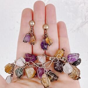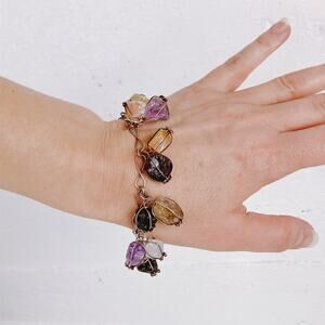 Hand-forged mid-century silver wire cradles brilliant and raw amethyst, citrine, rose quartz, aquamarine, and other natural stones in sculptural cages—an artisan charm bracelet with matching screw-back drops that wears with true modernist character.