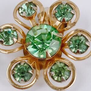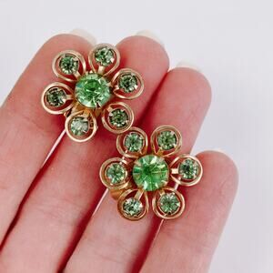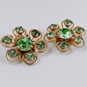 VTG Mid Century Uranium Glass Earrings Green Rhinestone Floral Clip On