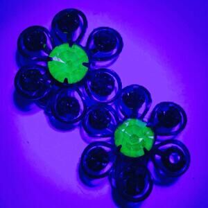 Retro floral earrings with sparkle and a sleek atomic-era vibe—bright uranium-glow centers framed by vivid green petals.