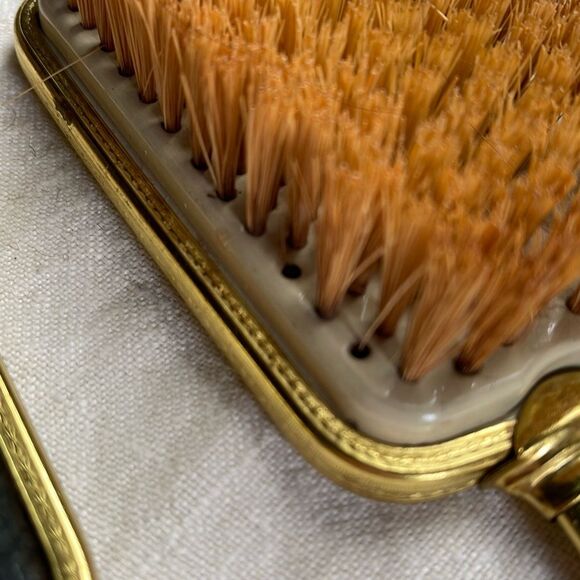 VTG Midcentury vanity set Art Nouveau styles brush & mirror in box. There are some brush bristles missing. See pic. Mirror has some crackling around edges. Some wear on gold tone metal.
