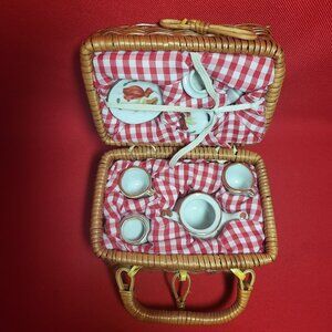 VTG Miniature Doll 9 Piece Angel Tea Set in Lined Wicker Picnic Basket