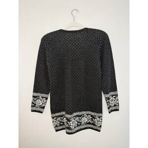 Soft and cozy black knit sweater dress with a white floral border pattern. The relaxed fit and subtle dotted knit give it that effortless Scandi charm with a touch of cottagecore coziness. Perfect for chilly days, layering with tights, or pairing with boots for an easy winter look.