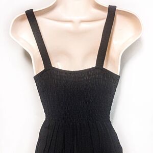Elastic shoulder straps, raised waist, smocked back, full and swingy skirt hits just below the knee, all in black 100% cotton, no lining.