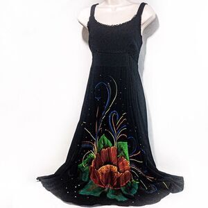 VTG Moda Brasil Black Smocked Sundress Hand Painted Made in Brazil Sz M
