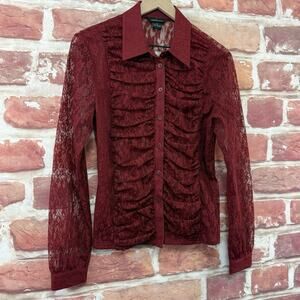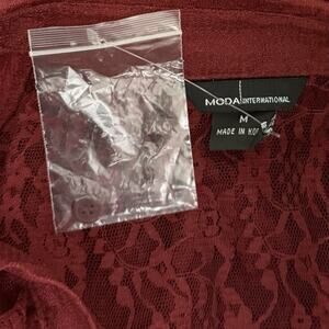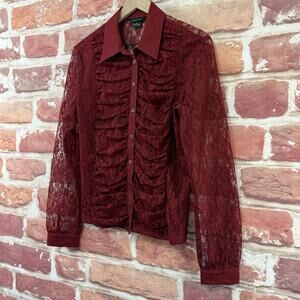 VTG Moda International Top Womens M Red Floral Lace Romantic Chic Sheer Shirt