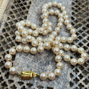 Vintage Monet 28” Cream 8mm Faux Pearl Necklace Box Clasp Hand Knotted. Faux pearls are made of glass. It’s marked “Monet” both on the front and back of the box clasp.