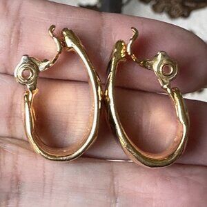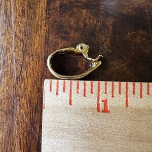 These 1" vintage signed with maker's mark Monet clip-on earrings are a must-have for any fashion-forward individual. The gold tone and black enamel striped diagonal design exudes a sense of elegance and beauty, making it perfect for special occasions such as Mother's Day, anniversaries, and birthdays. Crafted in the United States, these earrings are an original piece from Monet's fashion jewelry department. The oval shape and huggie style make them ideal for the lobe area. These 1" clip on huggie signed Monet vintage earrings are made of a beautiful yellow gold plated metal and have diagonal lobes with gold and black They are in good pre owned clean condition with trace use wear, the closures function properly, no issues. Please review the pictures for more details and size measurement information, thank you.