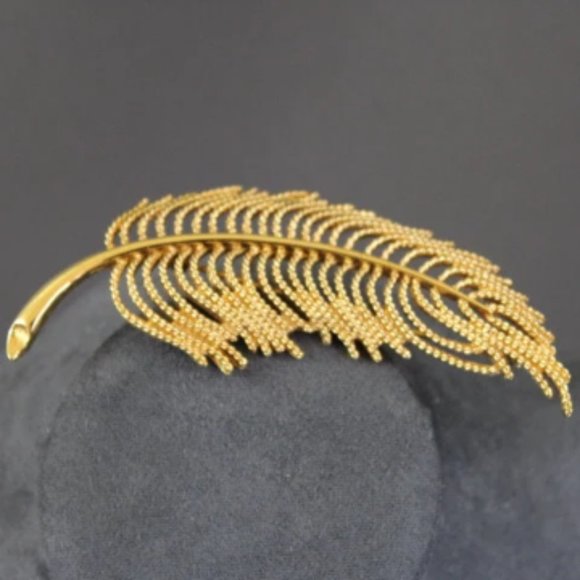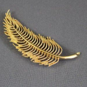 Vintage large feather brooch is a goldtone feather pin by Monet. Produced in 80s or 90s it is a big gold feather or a big leaf, depending how you view it. This feather has texture and open spaces to produce a light effect, even for its size. Can be worn many ways. This large gold brooch is in nice condition. 3.5 inches x 1.5 inches