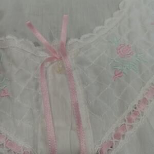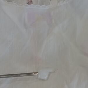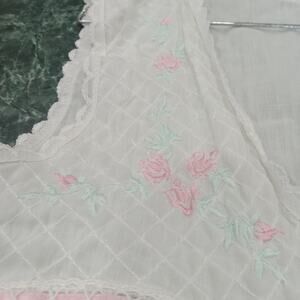 The VTG MoonDance Embroidered Nightgown is a vintage piece from the 1980s, featuring a boho look with ruffle and pintuck detailing. Made from a comfortable cotton blend material, this sleeveless nightgown in ivory color exudes a cottagecore vibe. The brand, Moon Dance, adds a touch of originality to this nostalgic piece, making it a unique addition to any woman's sleepwear collection. Perfect for those who appreciate vintage charm and feminine details in their sleep attire.