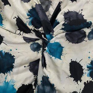 Vintage Moschino Splattered Polka Dot Blue White Silk Sleeveless Top. Artsy blue splatters design with gathering to create texture and a modest v-neck. True vintage designer piece to add to your collection. In good condition with minor pulls that can only be seen when inspected closely.