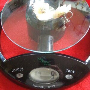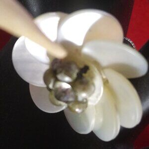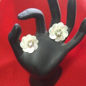FLAWS :  (pic 13 I think  shows the center  color discrepancy between the 2 earrings the best ) The center of the mother of pearl petals have small  faux pearls that are discolored , perhaps even wear on the finish flaking,  some of the tiny faux crystals are discolored and some  missing.  On the back there is wear to the silver tone finish ( last picture) .  These are vintage condition but still lovely in my opinion. Lots of memories with these pretties.  Quarter in pictures above to help visualize size , weighs 9 grams or .32 ounces . Questions are always welcome.