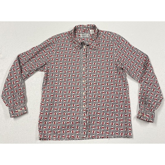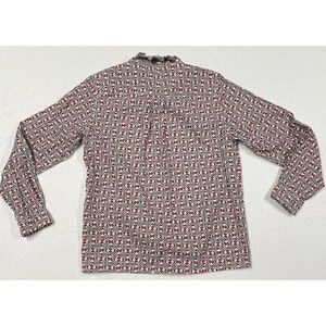 Experience the vintage charm with this 'Mr. Witt' button-up top in size 12. The geometric pattern in white, black, and red adds a touch of designer elegance to your wardrobe, while the collared neckline exudes sophistication. Made with high-quality cotton material, this pre-owned top is perfect for those who appreciate 70s fashion. The vintage tag adds a unique touch to this already one-of-a-kind piece, making it a must-have for any fashion-forward woman. Missing very top collar button. Both backup buttons present if you desire to button your collar all the way up.