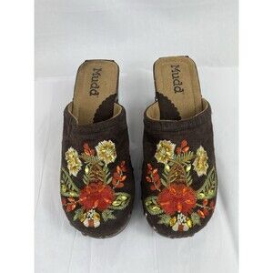 Mudd embroidered clog heels featuring rich brown faux suede uppers with vibrant floral embroidery and jeweled details. These shoes have a classic Y2K boho look with brass-tone studs, a chunky wood-look heel, and a comfortable slip-on mule design. Perfect for fans of early 2000s fashion or anyone looking to add a bold statement piece to their wardrobe.