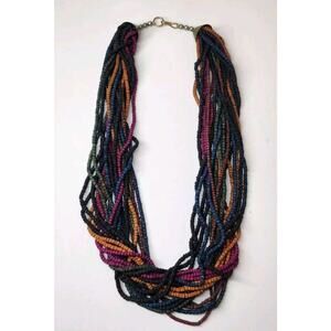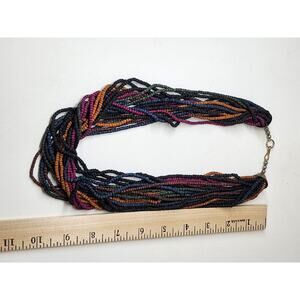 VTG Multi Strand Colorful Wood Bead Silver Chunky Bold Necklace Boho Earthy Bold