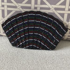 Stunning vintage beaded clutch features hand-beaded craftsmanship. Features 1920's Art Deco style with a shell-shaped or fan-shaped silhouette with scalloped edge. Adds old Hollywood glamour to any occasion-especially fitting for holiday/new years parties. Gorgeous, glittery, shimmery rows of tiny glass seed beads in blue, green, red, silver and black--micro beading work. Very good to excellent condition. Can also be used as a fancy makeup bag or a all-purpose pouch in your bag. I ship fast--ready for your holiday/new years party or other celebration festivities!