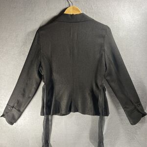 Elevate your wardrobe with this vintage black linen blend blazer from My Boyfriend's Back. The blazer features a solid pattern with lace, studs, and button accents, giving it a unique touch. The waist can be adjusted as desired with the chiffon ribbon on the back. The jacket has a regular fit, making it perfect for any occasion.