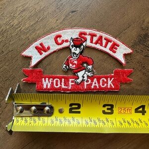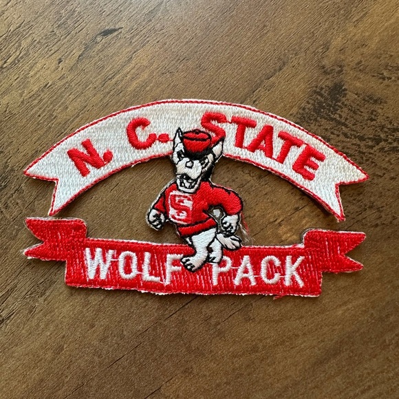 The product is a vintage North Carolina State Wolfpack football embroidered iron-on patch. This patch features the team's logo and is designed to be easily ironed onto clothing or other fabrics. It is a unique and nostalgic embellishment for fans of the team or those who enjoy sewing and crafting projects related to football. The embroidered design adds a touch of authenticity and durability to the patch, making it a great addition to any collection or project.